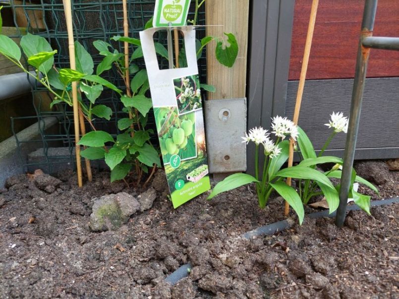 De tuin begint langzaam groen te worden: Met speciale aandacht voor de daslook die toch nog is opgekomen en nu mooi bloeit. Links de kiwibes die in het hoekje bij het gaaspaneel omhoog mag groeien. Het hoekje aan de andere kant heeft wat opbergruimte gekregen en de aardbeienbakken die eerder aan de schutting hingen hebben een plekje gekregen tegen de muur. Aan de schutting een nieuw insectenhotel waar de bijen af en aan vliegen.