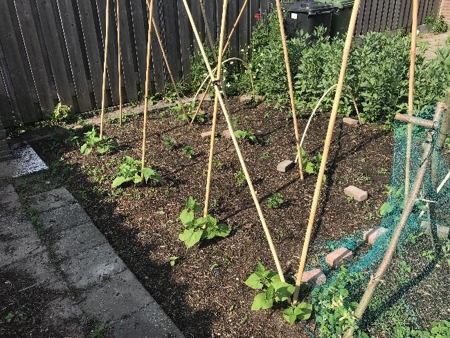 Ik heb de augurken buiten neergezet, deze week nog even de stokken vervangen voor langere, want ik vrees dat ze hoger willen klimmen dan deze stokken. Het is het ras Hokus, die zou goed geschikt moeten zijn voor buitenteelt, dus dat scheelt ruimte in de kas.