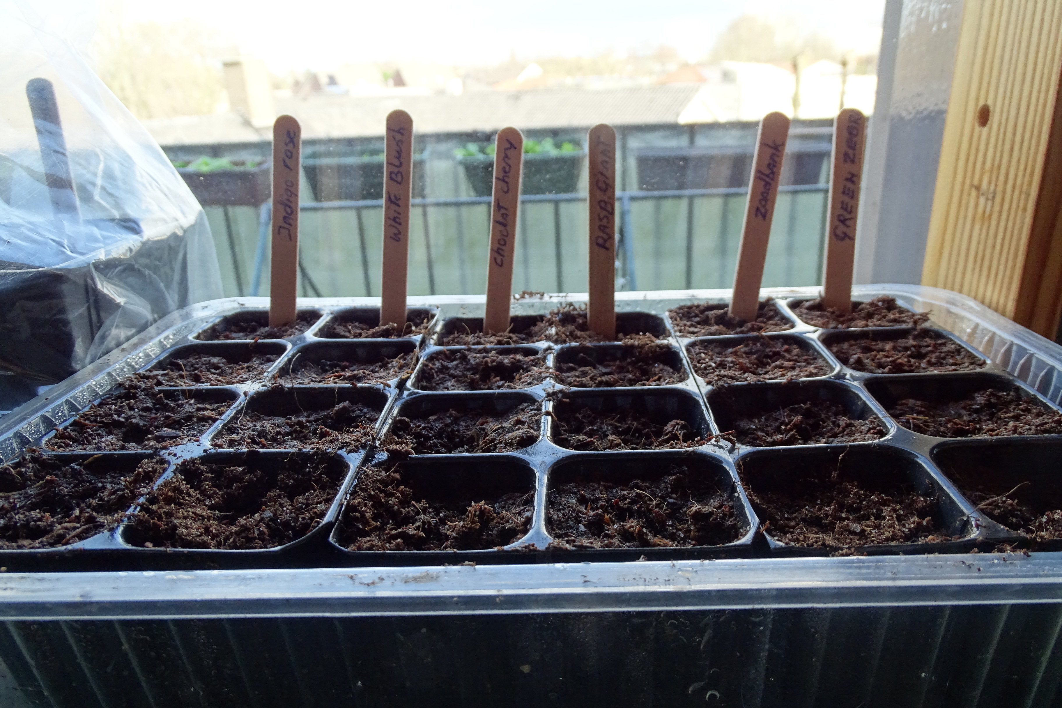 Er staat nog veel meer sinds vandaag. Zes tomatensoorten zie je hier. Bedoeld om allemaal
