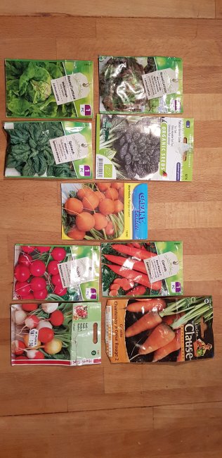 Gisteren aan het week geweest met een schitterend zonnetje. Eén bed schoongemaakt en ingezaaid. Wortel, radijs, pootuitjes (wit en rood), spinazie, tatsoi en sla. Het meeste van de Lidl, maar een paar had ik nog van andere winkels.
