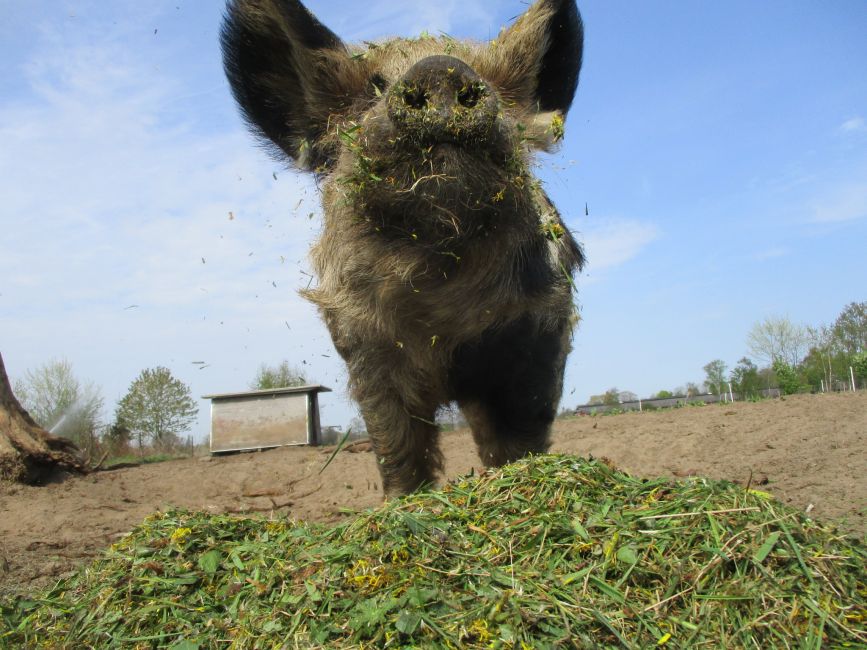 We konden weer gras maaien in de strook langs onze varkensvelden. En dat gemaaide gras is dan meteen voer voor die varkens. Hun eigen velden zijn wat saai en stoffig nu. Dus het werd wel op prijs gesteld.