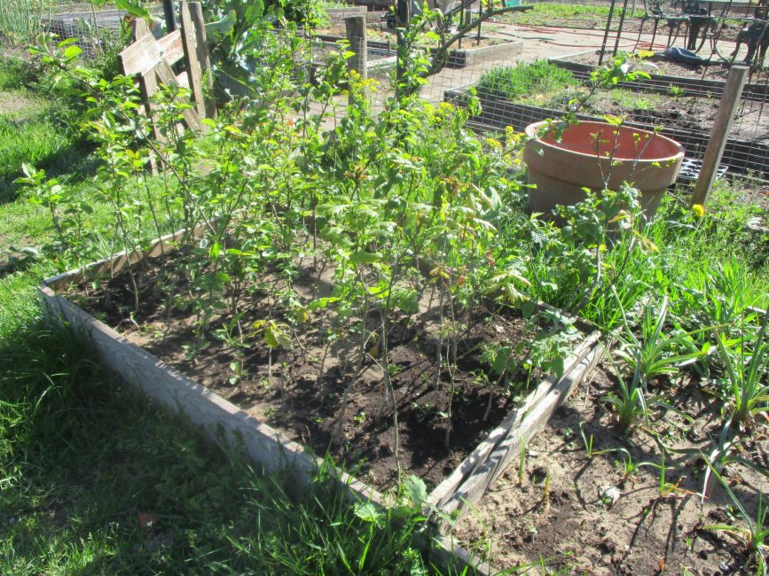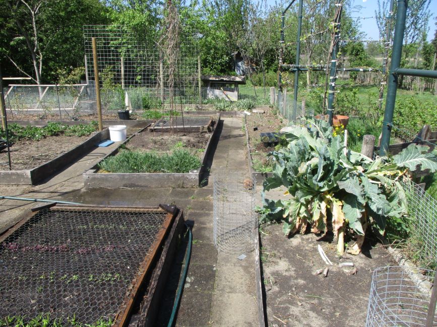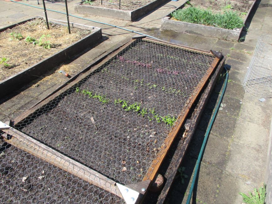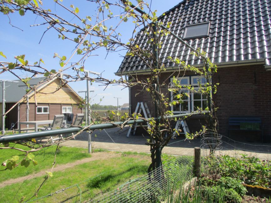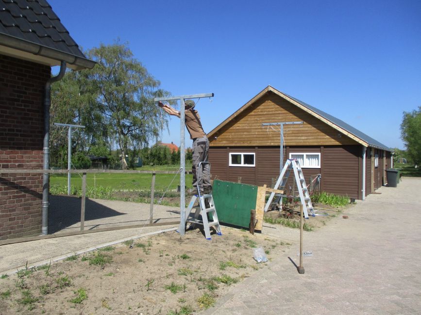 Joep heeft draden gespannen tussen de waslijnpalen waar mini kiwi's komen te groeien.