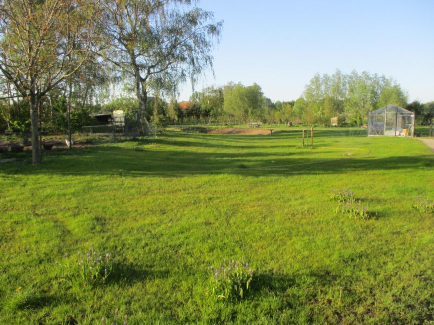 Onze vallei is prachtig groen. Als je er loopt dan zie je nog wel wat plekken waar het gras wat minder goed groeit. Maar we sproeien regelmatig, hebben wat mest gestrooid, en hier en daar nog een handje graszaad. Komt helemaal goed!
