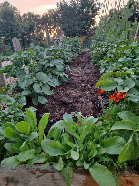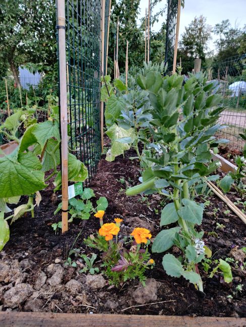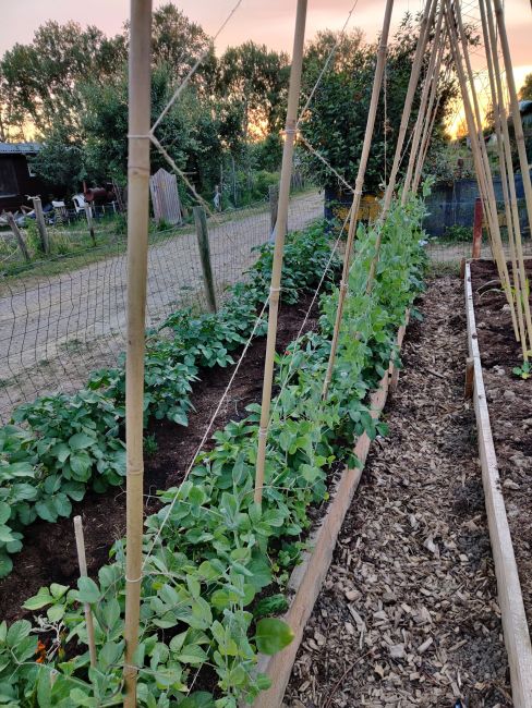 Het gaat goed in dit bed. De aardappelen komen langzaam in bloei en de kapucijners grijpen steeds hoger de stellage in. Ik heb de eerste bruine vruchten al zien zitten 😄 en de eerste goudsbloem laat haar kleuren zien. Het was een mix dus ik ben heel benieuwd wat eruit gaat komen.