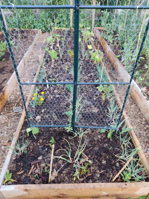 Ik heb twee rozenbogen naast elkaar gezet, goed vastgebonden met tie wraps en daarna heb ik er kippengaas aan vastgemaakt. Het idee is dat in het ene bed twee pompoenen (mini blue hubbard en flespompoen) en in het andere bed een klimmende courgette (long green trailing) hun weg omhoog gaan vinden. Het is een experiment, niet erg als het mislukt. Wel erg leuk als het wel lukt. Heb er ook nog wat klimmende bloeiers bij gezet, dus hopelijk wordt het een prachtig gezicht.