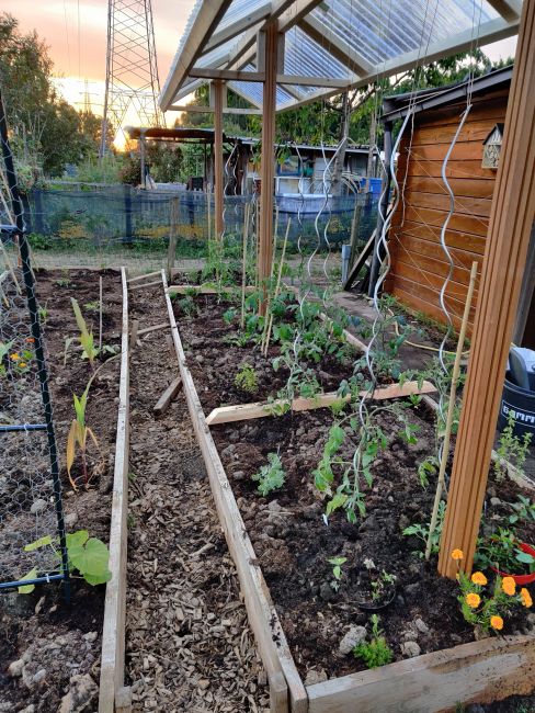 Afgelopen weekend heel druk geweest met het installeren van het tomatenafdak (met dank aan een geweldige schoonvader). Ziet er mooi uit en ben er heel blij mee. De zijkanten zijn nog vrij open, maar bij hele erge slagregen kan ik daar alsnog zeil spannen. De tomaten zijn stevige planten geworden, ondanks dat ze thuis vrij warm en licht stonden. Ze hebben een schepje houtas en wat brandnetels mee gekregen. Er staat: