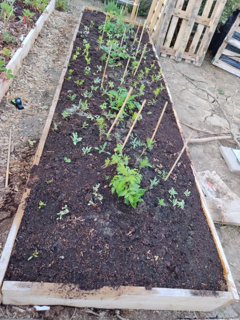 Jaaa! Eindelijk ook het bloemenbed ingeplant. Toen ik begin mei doorhad dat het nog even ging duren voordat ik voldoende grond had voor dit bed heb ik een deel van de Dahlia's al voorgetrokken in de kas, dus gelukkig staat er al wat. Verder hele kleine zaailingen nog. Door ruimtegebrek kon ik helaas veel dingen niet verpotten in grotere potten. Gelukkig is er tot nu toe niet veel gesneuveld. Er staan nog wat bakken te wachten in de kas tot de planten iets groter zijn. Ook dat gaat er de komende dagen met de regen allemaal uit.