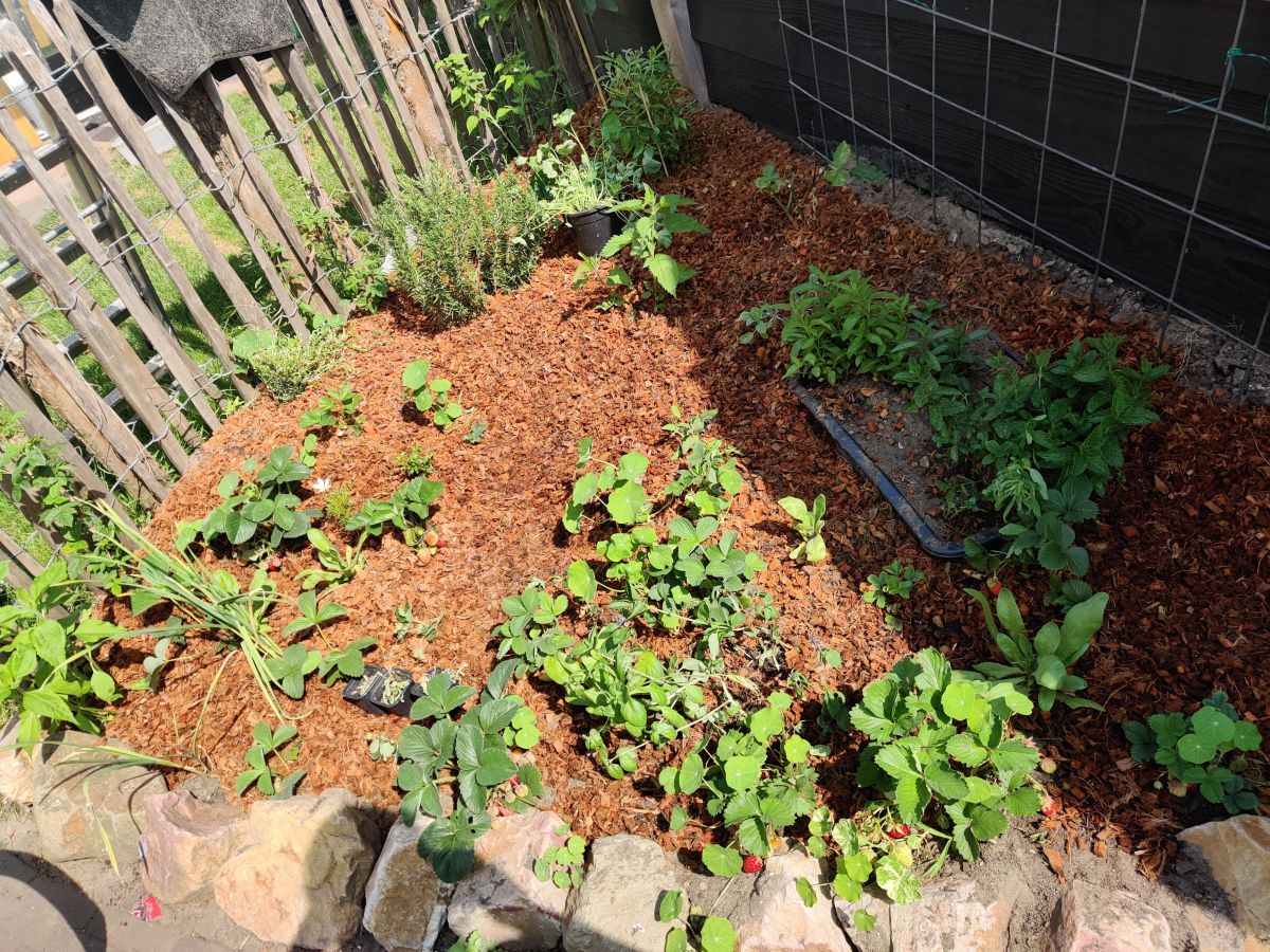 Ook in de achtertuin is er hard gewerkt. In de voormalig moestuin (+/- 5 M2) zijn inmiddels een vijg, twee cranberries en een blauwe (roze) bes aan de collectie fruitplanten toegevoegd. Er stonden al drie verschillende zomerframbozen (die door hun verhuizing met snoei in maart nog niets gaan doen dit jaar ben ik bang) en een braam (zelfde verhaal als de frambozen). Daarnaast staan er nog aardbeienplanten die ik over had van vorig jaar, een aardpeer en wat vergeten knoflook die dit voorjaar opeens zichzelf liet zien. De bedoeling is verder vooral heel veel kruiden bij te zaaien de komende weken. Gisteren een speciekuip voor de munt ingegraven. Deze kon je daarna tot de rand vullen met het zweet dat ik verloren ben. Slecht plan met deze temperaturen 🤣