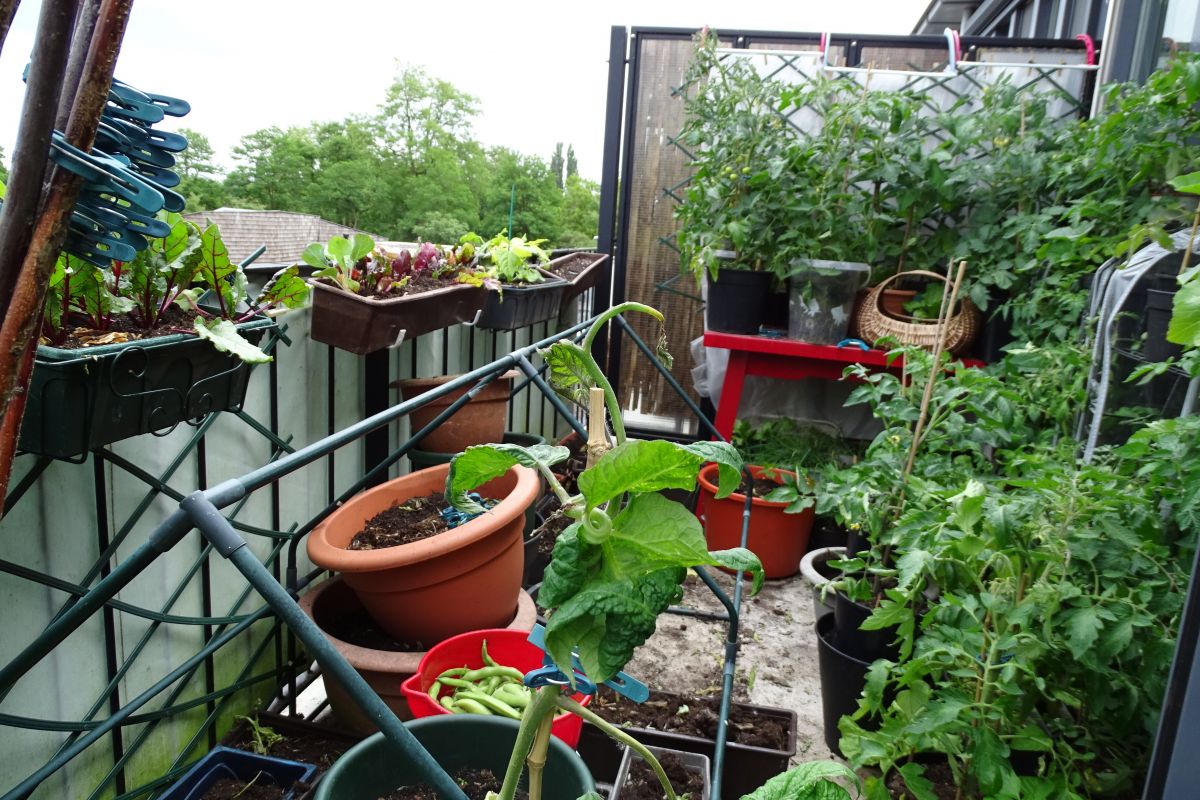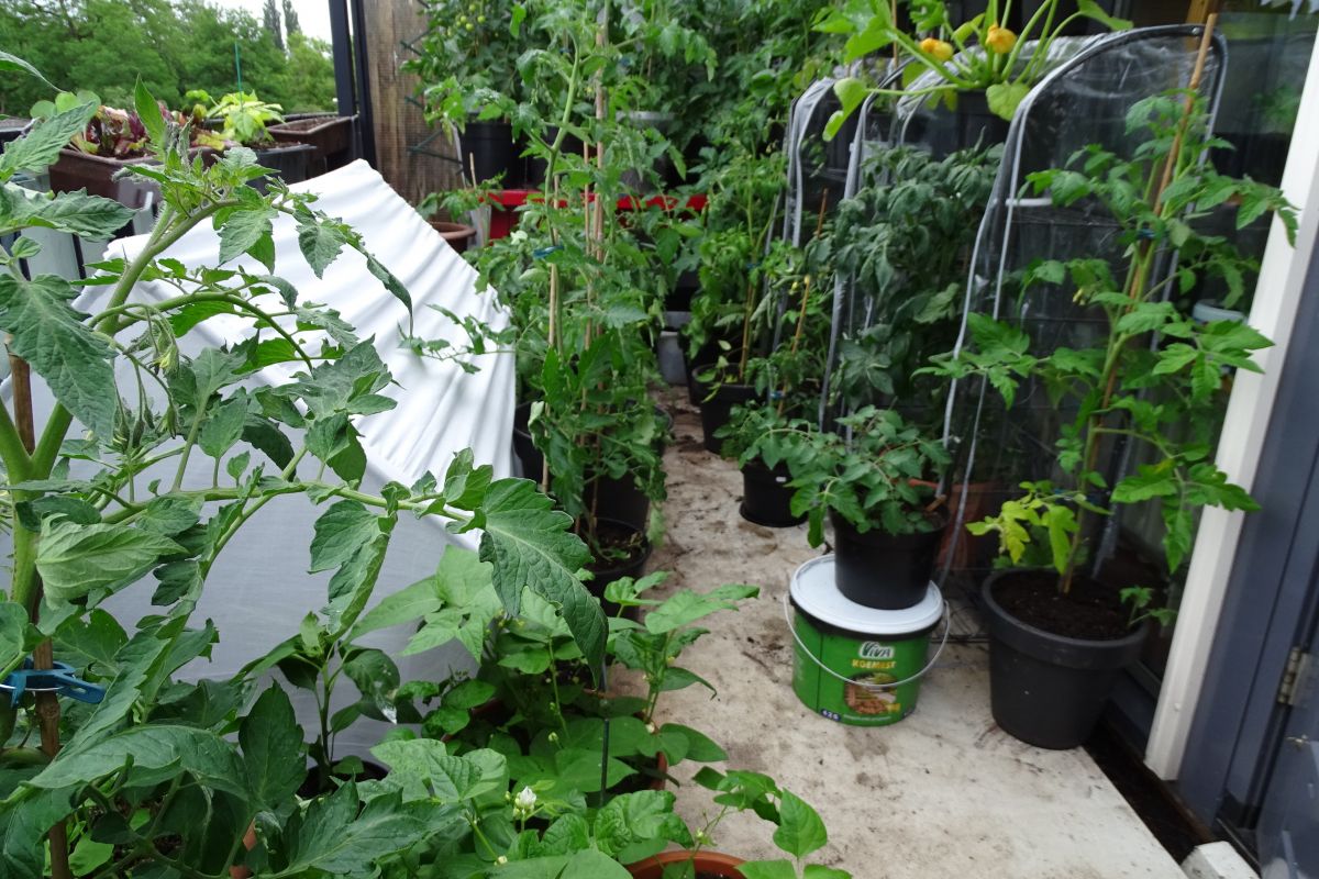 De geoogste tuinbonen, in de rode emmer, gingen richting de keuken
