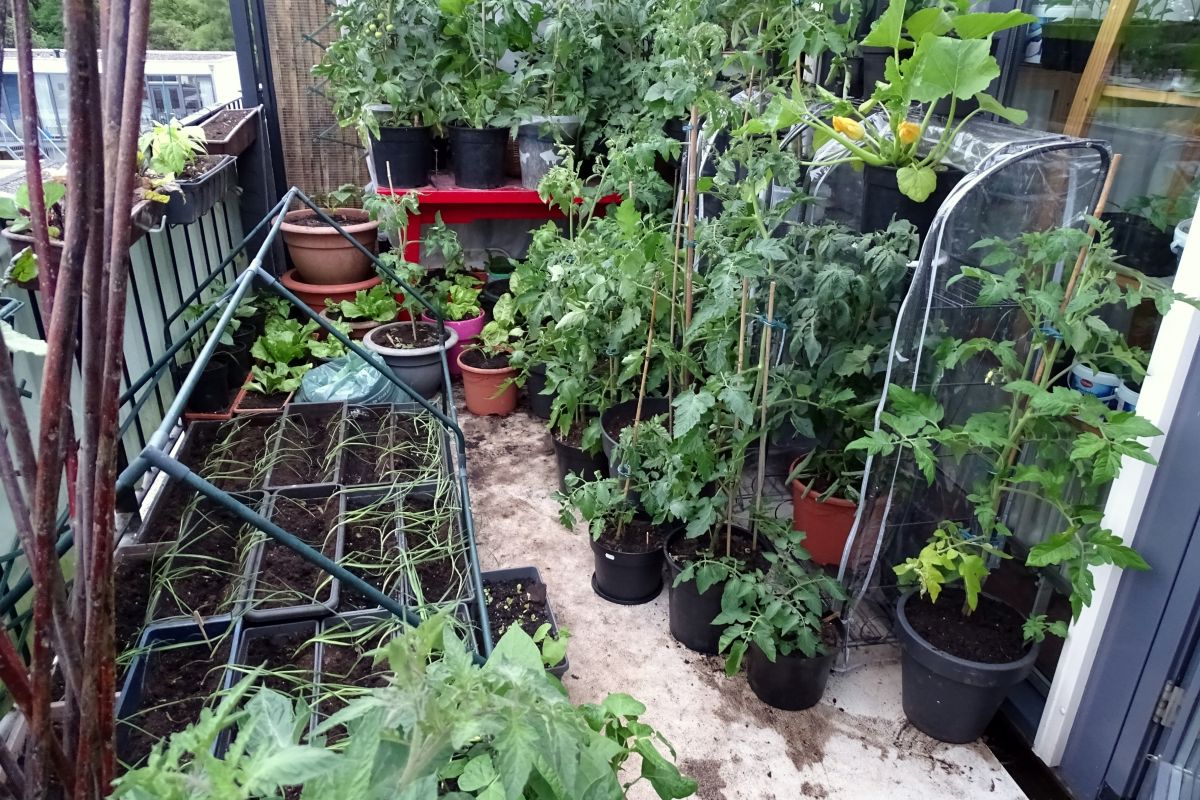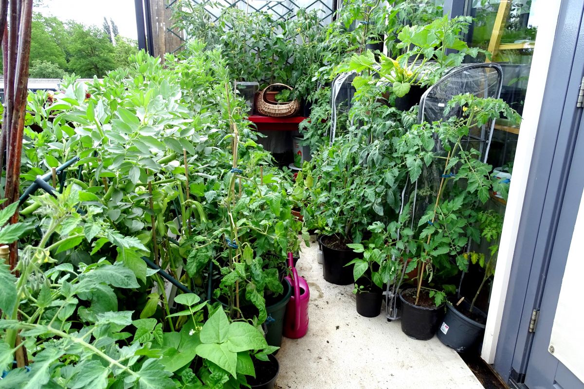 Kijk, links staat tussen de tuinbonen het frame van de kas die ik straks nodig heb.