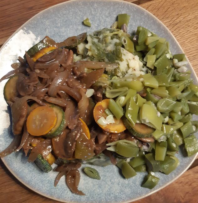 Aardappel, zomerpostelein stamppot met snij en pronkbonen er bij saus van uien, kruiden en courgettes.