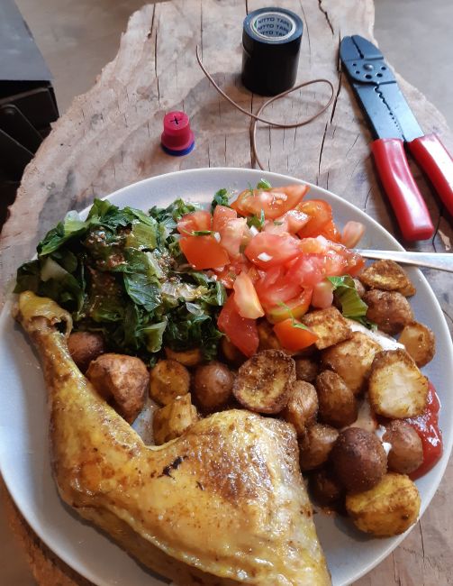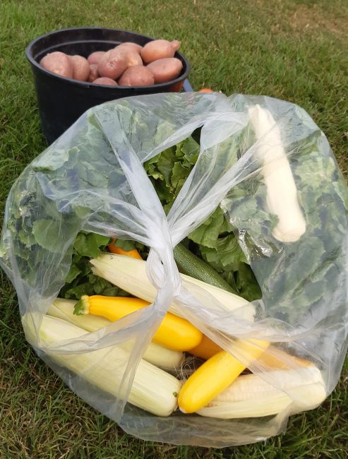 Als het ietsje afgekoeld is oogst ik wat. Er zijn groenten klaar en er moet natuurlijk gegeten worden.