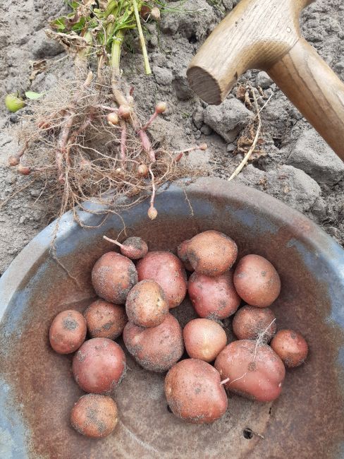 Hier de opbrengst van een plant. Het wisselt per plant met kleinere knollen en grote joekels: