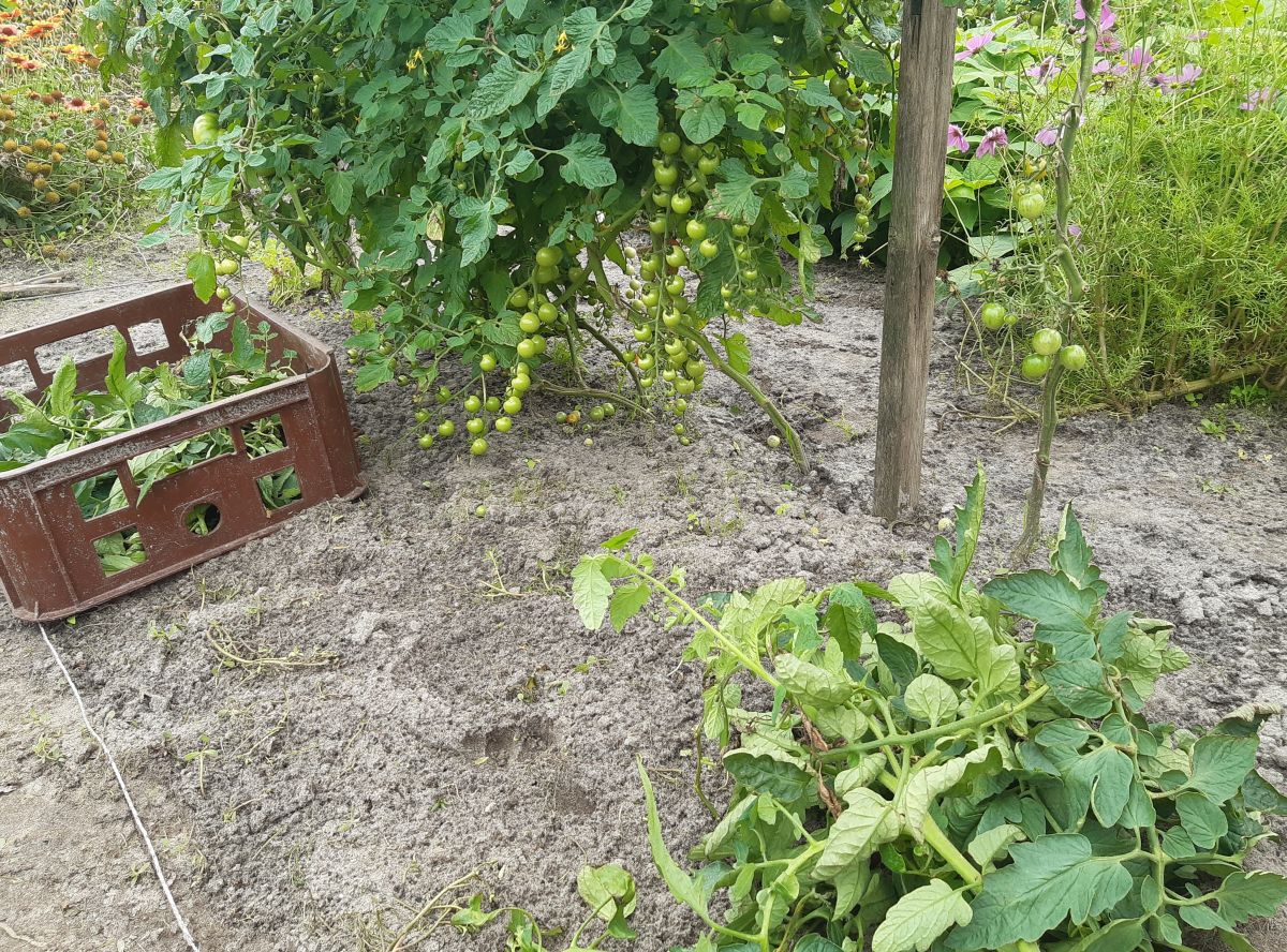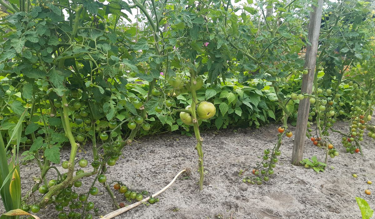 De tomaten moeten ontdaan van overtollig blad en gediefd en aangebonden.