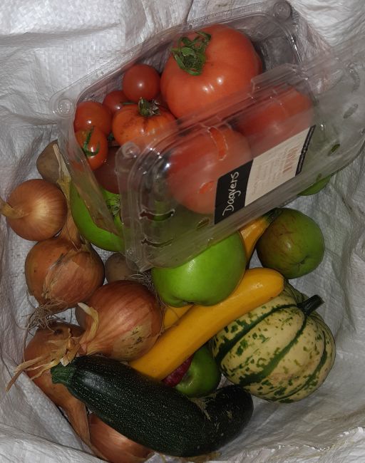 Ik oogst wat pompoenen om uit te delen en vul een tas met proviand. Omdat ik alleen ga is er niet zo veel nodig.