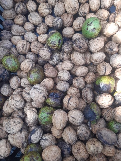 Ik help de vermoeide bomen en tik de mooie walnoten van hun takken.