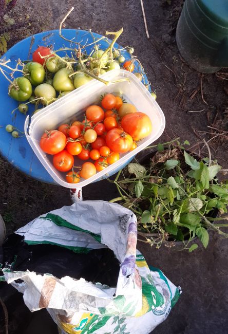 Ik ruim weer wat tomatenplanten op. Het is nog warm in het kasje.