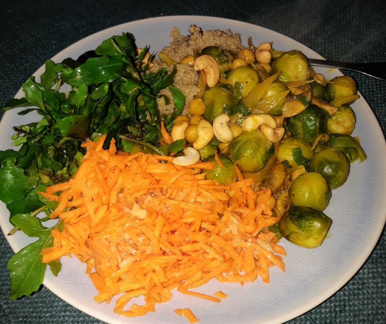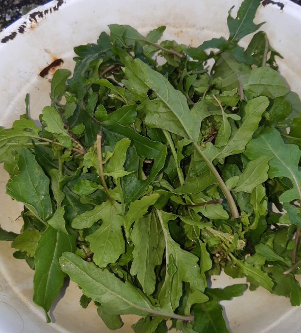 De rucola op het bord, samen met gekochte wortel en spruiten.