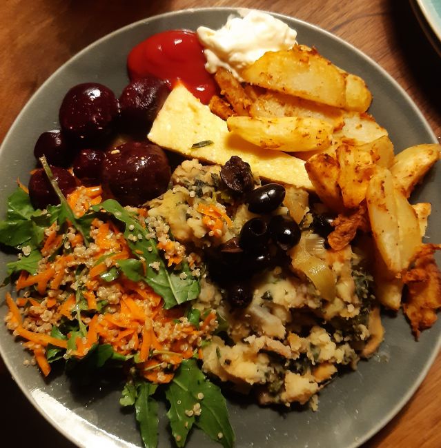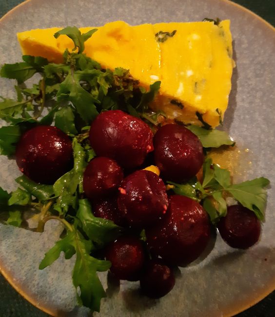 Op tafel andijvie, die nu ook op moet, met Triplo aardappels uit de oven.