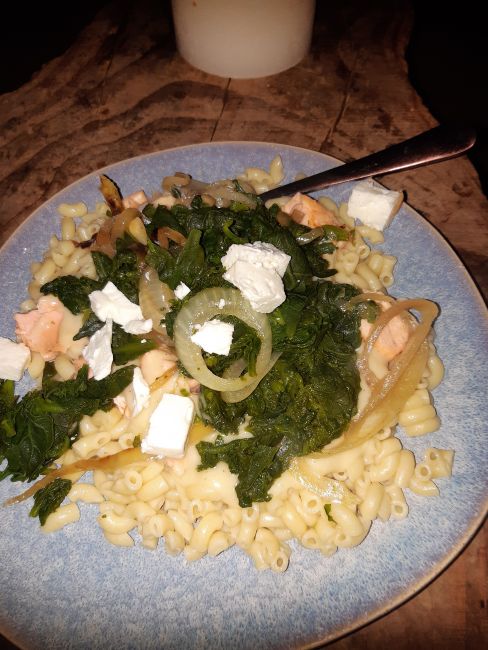 Hier een snelle maaltijd van pasta met N-Z spinazie.