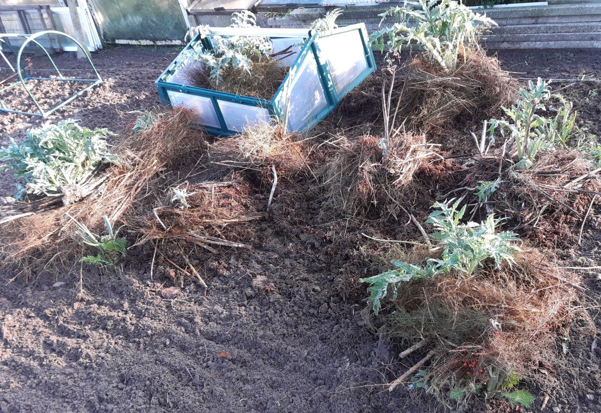 Buiten pak ik de artisjokken in. Eerst schoonmaken, daarna een laag verse mest en dan aspergeloof er om heen.