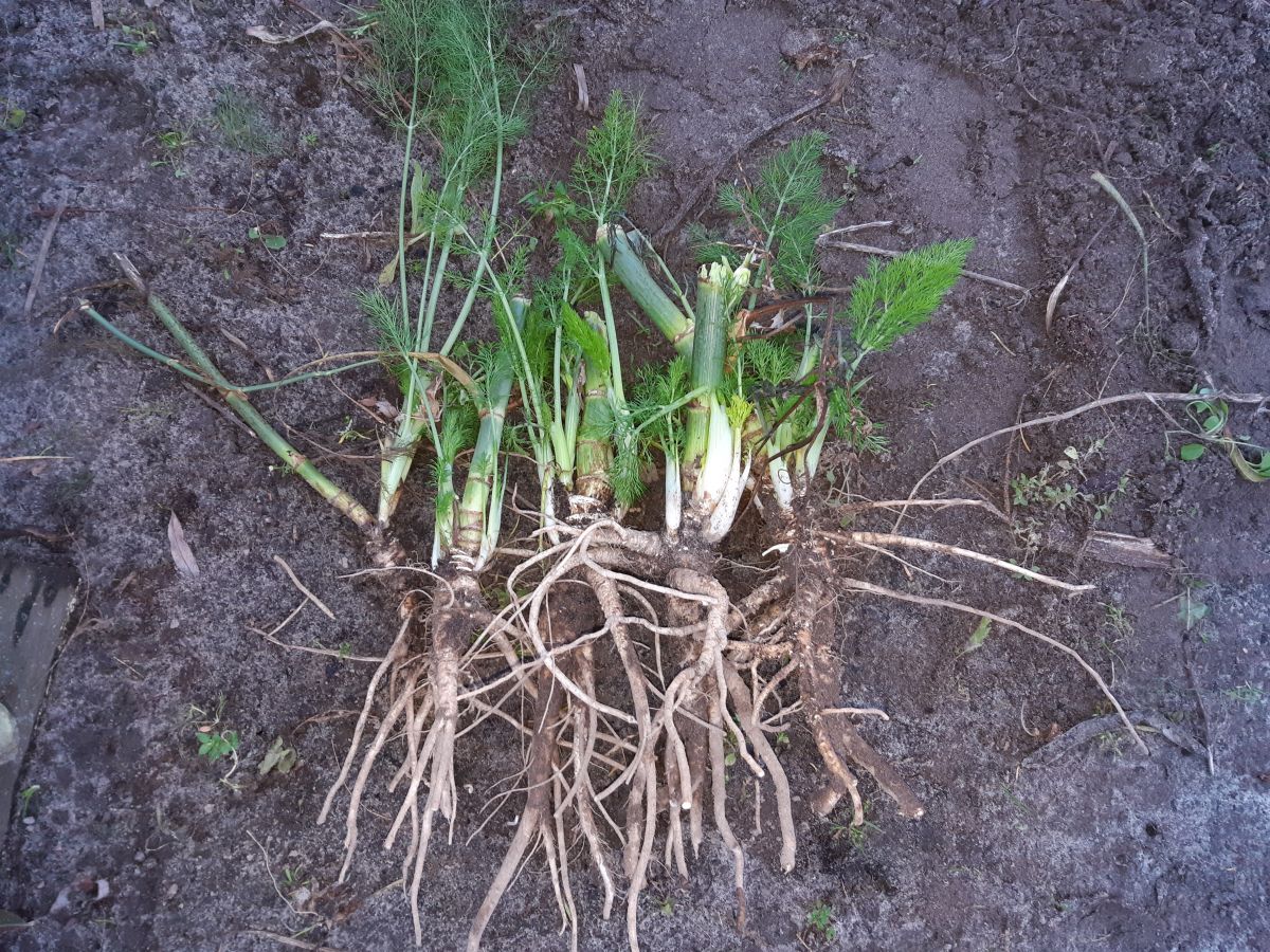 Tussen de artisjokken stond nog wat venkel. Die loopt na de oogst weer uit vanaf de wortel en misschien zet ik deze venkelwortels nog op een verloren stukje.
