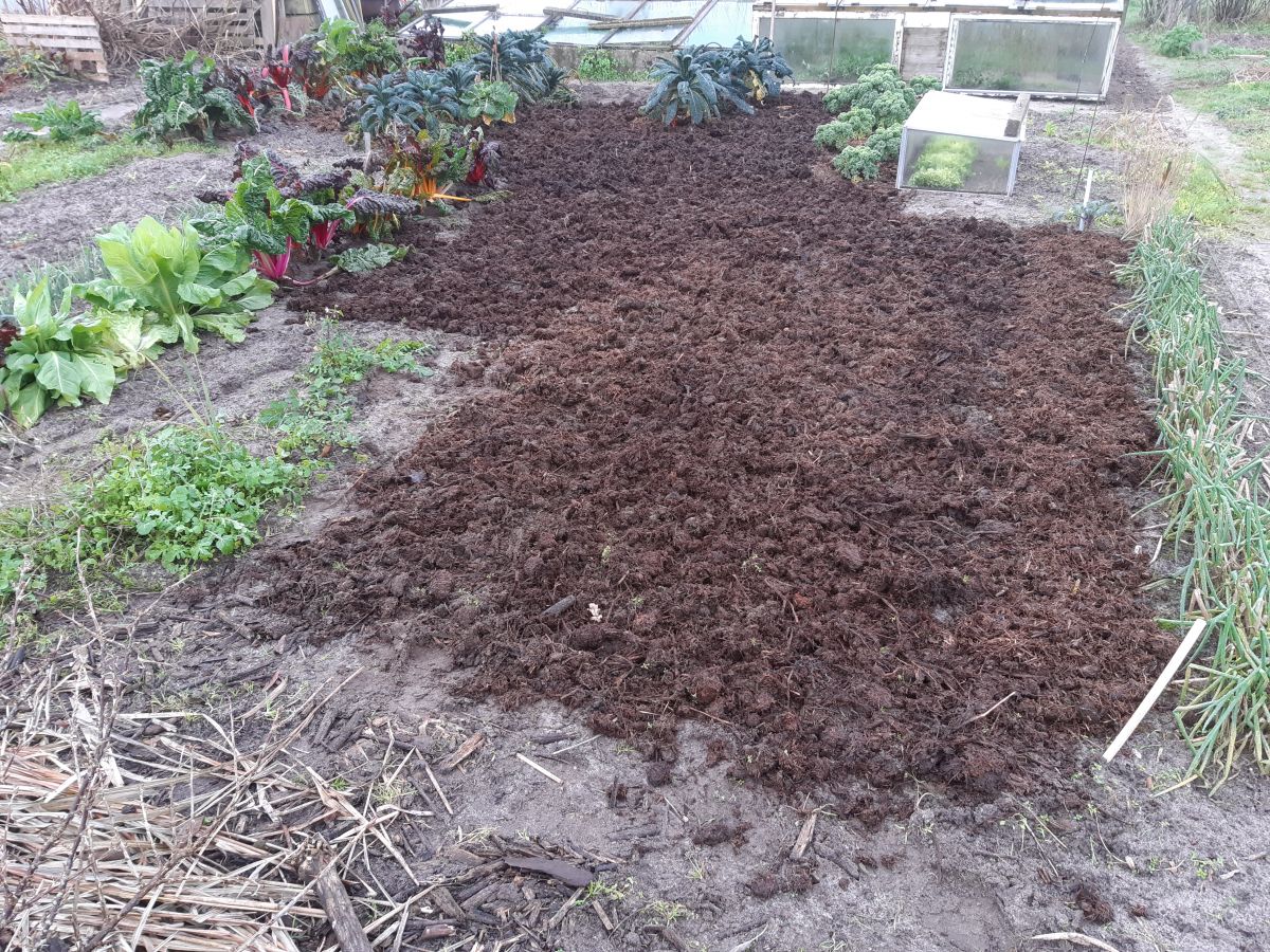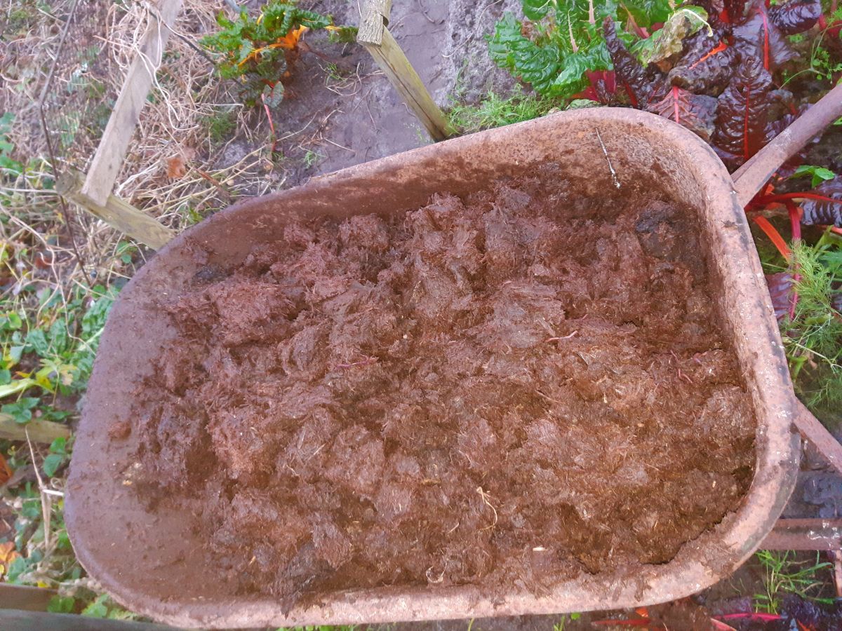 Op het aardappelveldje 2021 heb ik deels verteerde mest aangebracht wat een half jaar in een compostbak heeft gelegen.