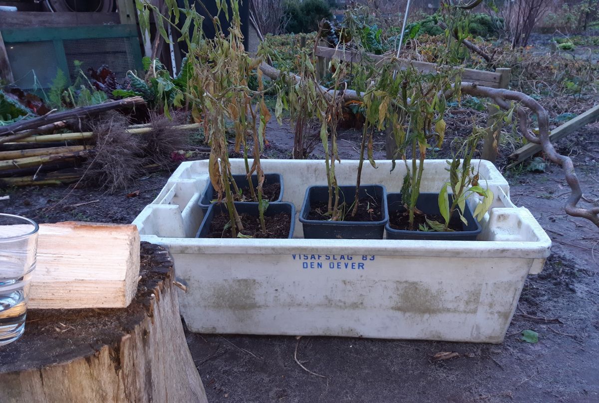 Ik verzamel de laatste planten die niet tegen nachtvorst kunnen en zet die in het tomatenkasje.