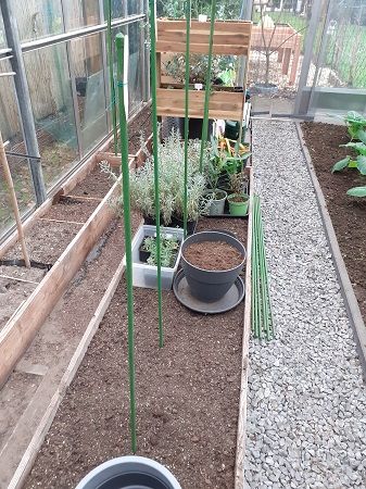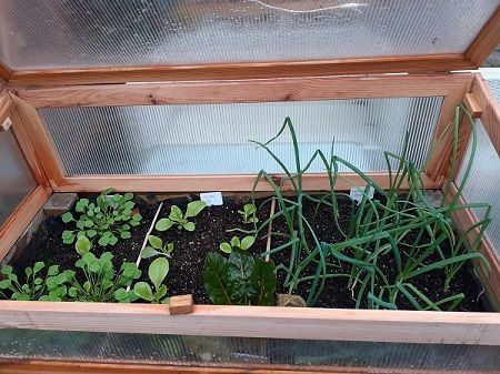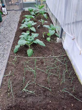 In de ene helft van de kas wat bloemkolen en winterui, aan de andere kant de plantjes die in de kas mogen overwinteren. En achteraan (achter de aardbeienbak) ....heel veel rommel 😉.