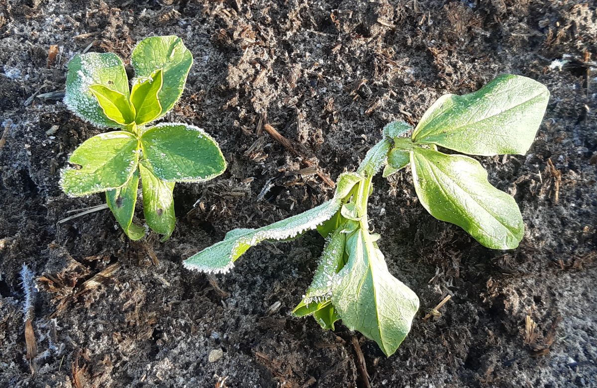 De Aquadulce tuinbonen hebben ook wat moeite met de nachtvorst maar trekken gelukkig snel bij.