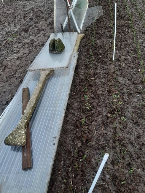 De knoflook staat nog laag en hoeft geen bescherming.