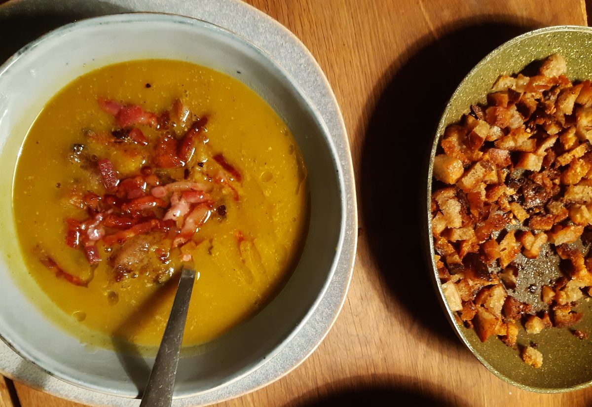 Hier met spekjes en croutons gemaakt van oud zuurdesembrood.