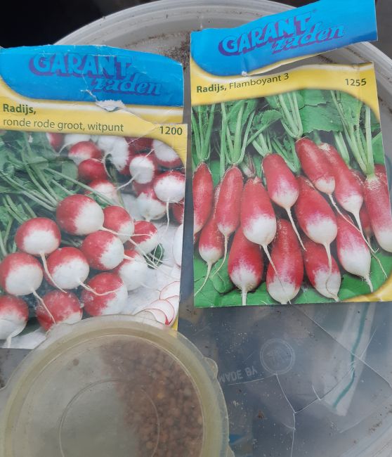 Ik zet nog een rij en zaai breedwerpig radijzen onder glas.