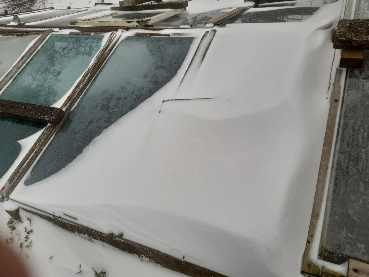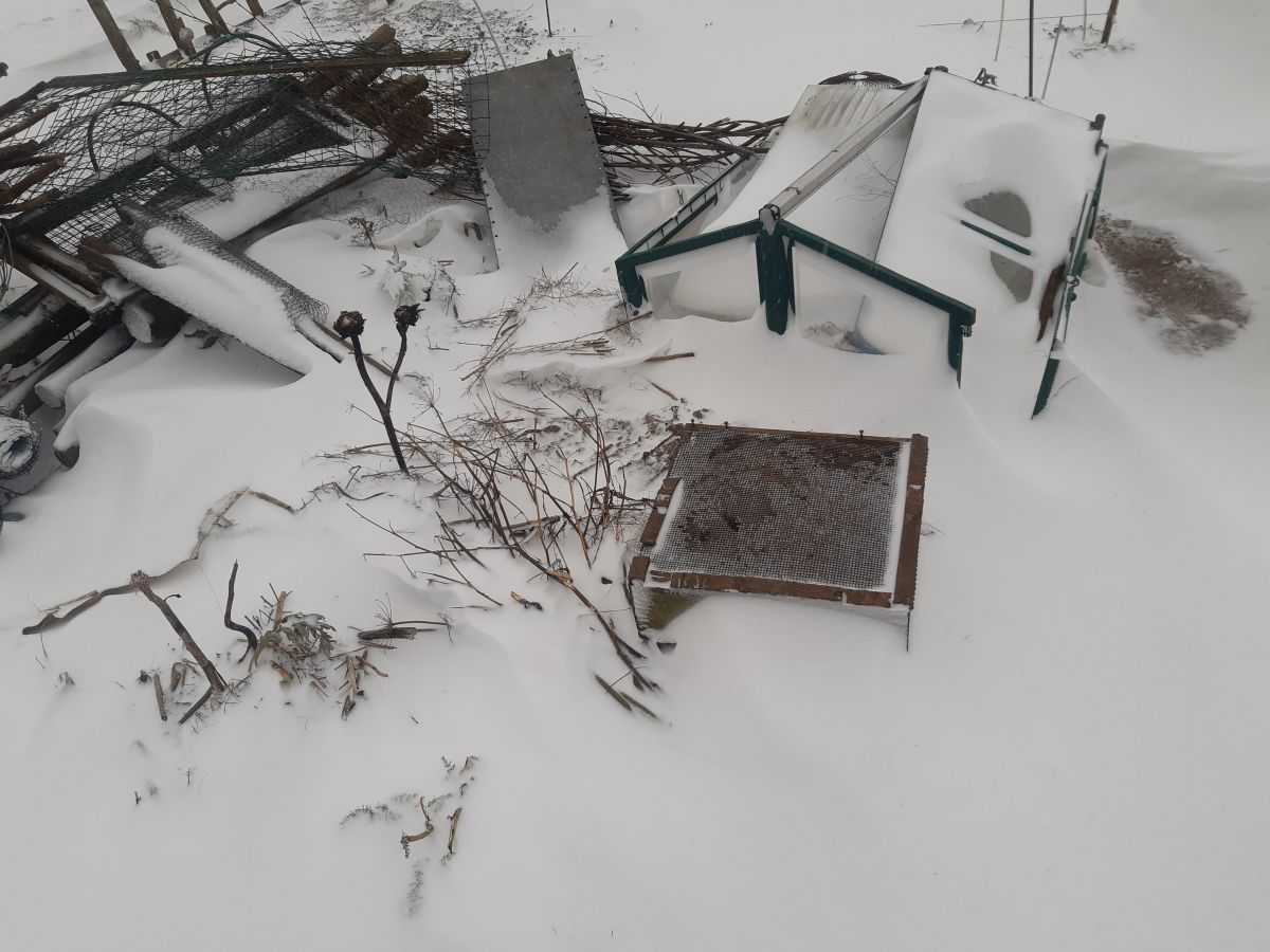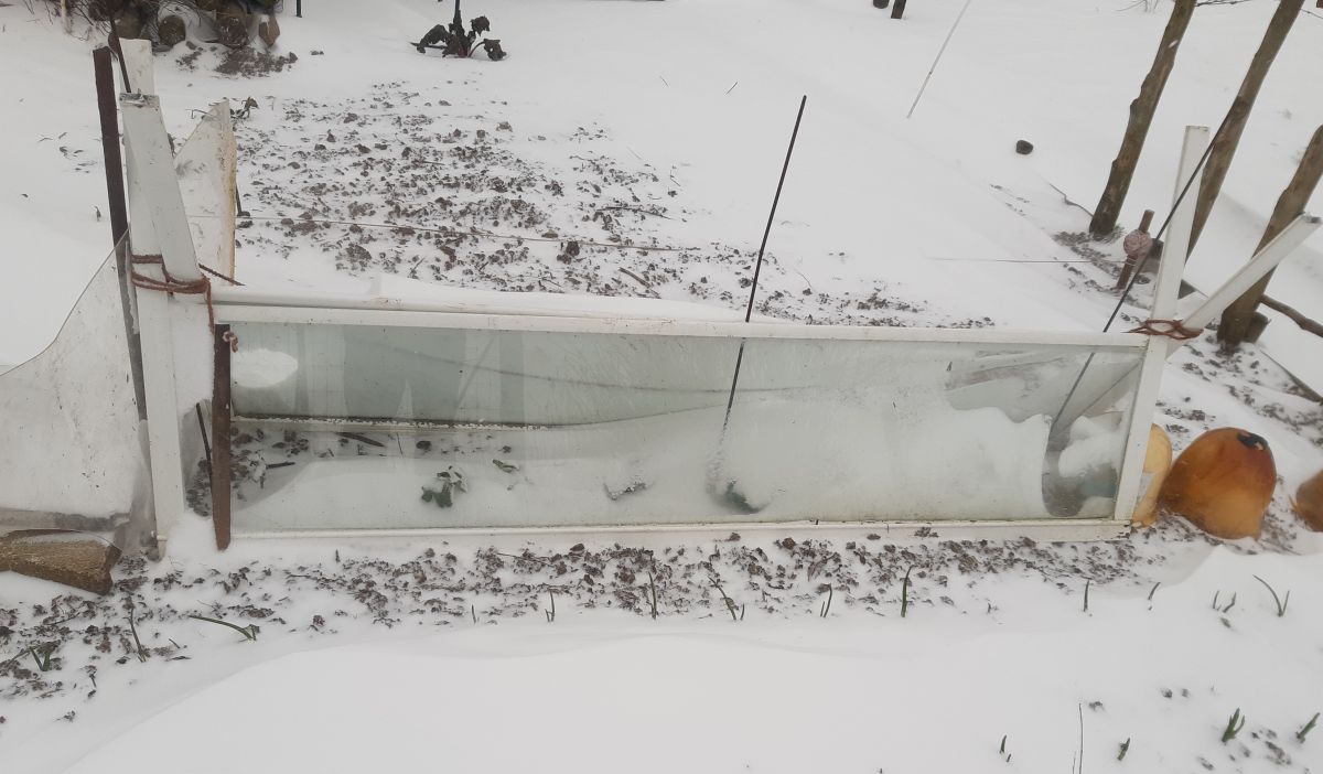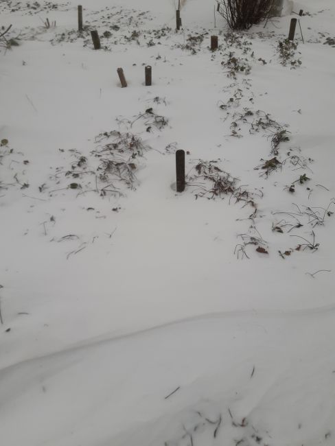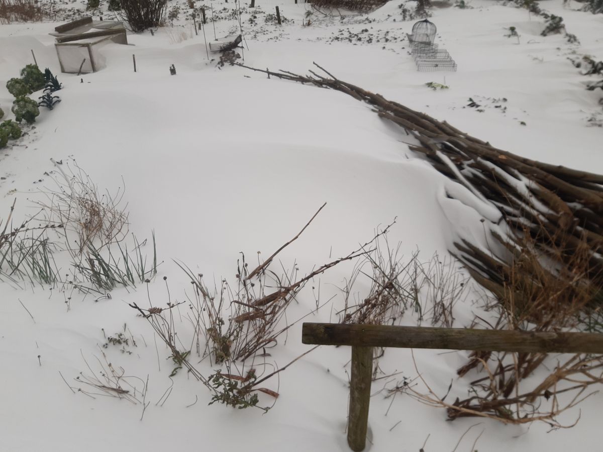 Het oude aardbeienbed is goed geïsoleerd met een laag sneeuw:
