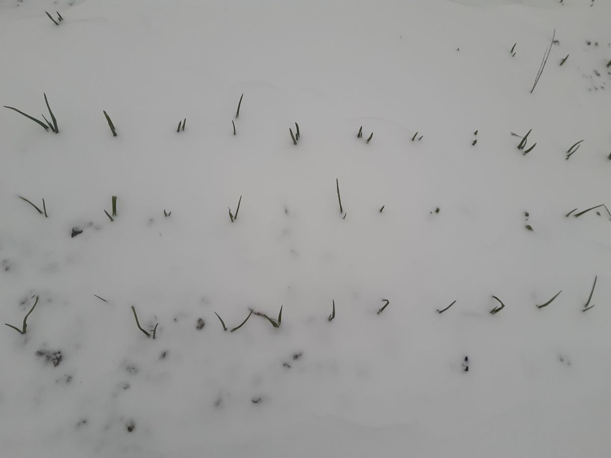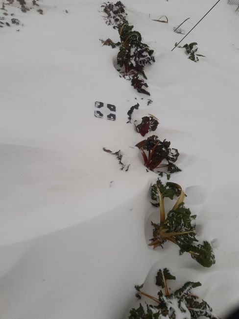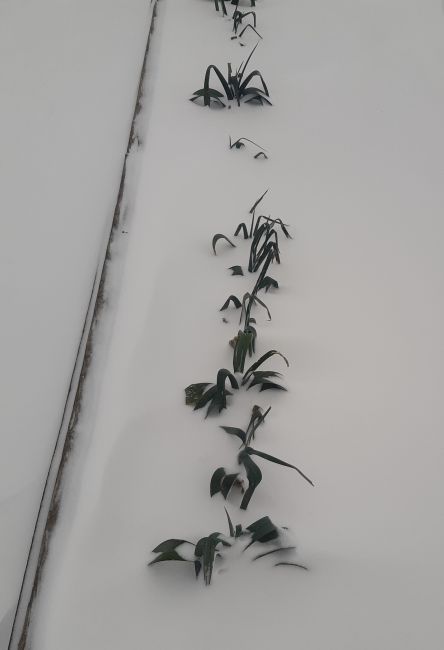 De knoflook staat meer in de wind en nog boven de sneeuw: