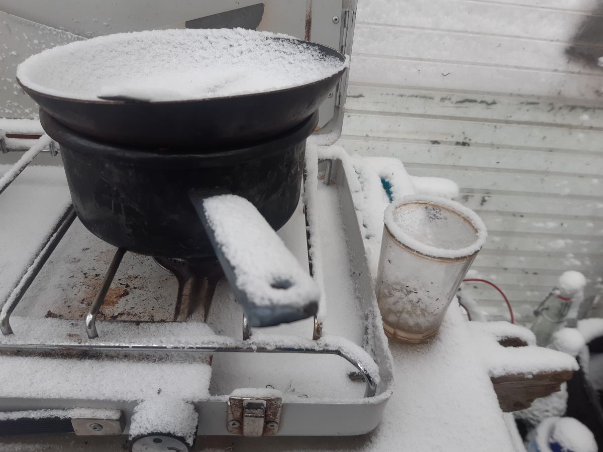 De platte bak was ook van binnen vol met stuifsneeuw.