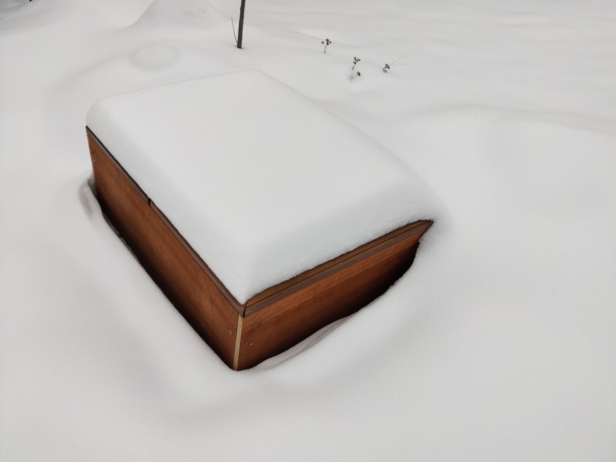 Het egelhuis zit ook onherkenbaar diep onder de sneeuw. Ik begrijp nu maar al te goed waarom de egel aan de westkant van de stapel planken is gaan slapen. Net zoals vlinder nr. 2 aan de binnenkant van de westmuur slaapt. Voor mij is de westkant de richting van wind en regen, koud. Maar het is nu de richting van warmte. Weer wat geleerd.