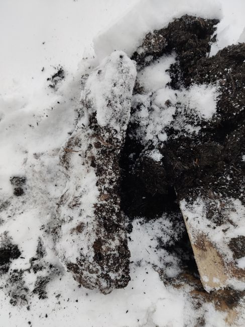 Omdat ik benieuwd ben hoe diep de bodem bevroren is onder de sneeuw, heb ik de spade gezet in de opgebrachte gemeentecompost. Het is een wat bobbelige bevroren plak, maar ik schat dat de bovenste 7 cm bevroren is. Maar het kan ook komen doordat alles daaronder nog droog was, er is niet veel regen gevallen