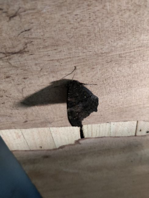 vlinder in winterslaap, hangend aan plankje.