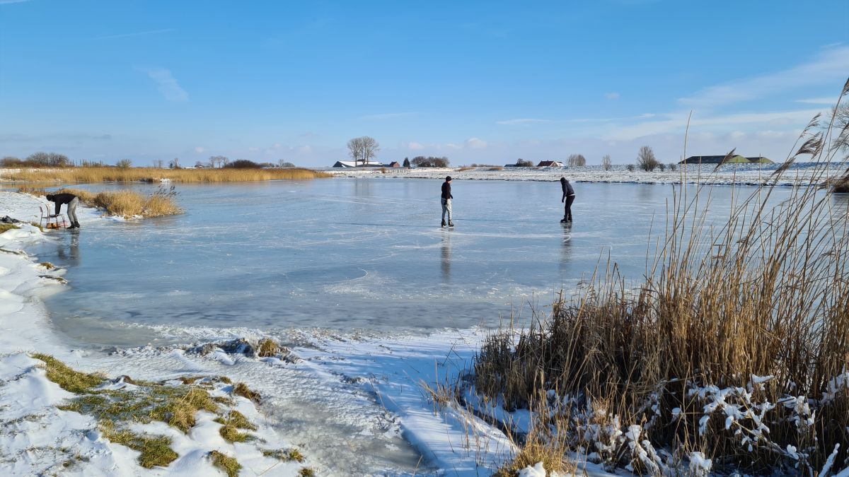Woensdagochtend had ik al de ijsdikte op de kreek bij mij achter gemeten. 5 cm aan de kant, midden op 6 cm. Ruim genoeg voor één persoon van 65 kilo.