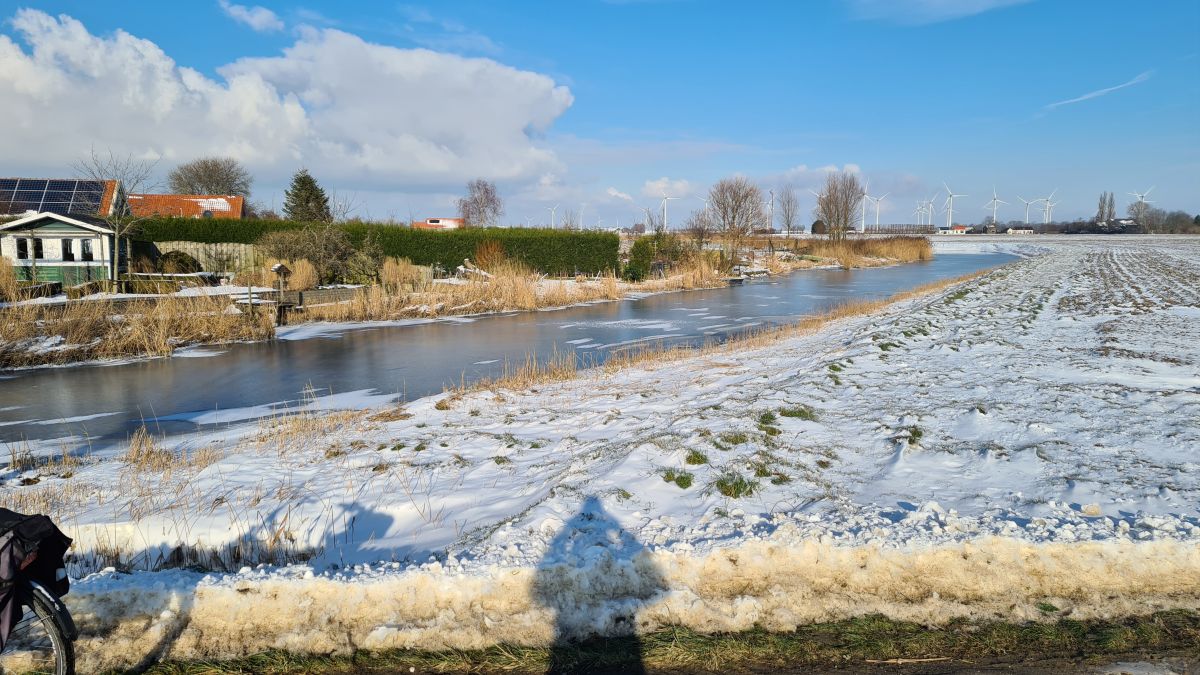 De moderne “gewone” fiets. Die is absoluut ongeschikt om door ijzige sneeuw plakkaten te rijden. Belachelijk. Voorheen stond de voorvork (en daarmee het voorwiel) schuiner, meer naar voren. Dat gaf en geeft meer stabiliteit. Fietsen van vandaag de dag zijn nerveuzer, ook met schone fietspaden is het lastiger om met losse handen te rijden. Maar met sneeuw: de moderne fiets wil veel liever links de berm in, of rechts de sloot in, in plaats van gewoon rechtdoor. Bah! En dit van een voormalig amateur wielrenner, met toen een zeer nerveus fietsje, maar wel eentje waar je prima met losse handen op kon rijden: Beide handen omhoog aan de meet. Bah!