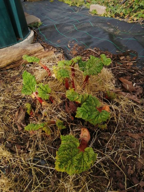 De rabarber heeft de kou goed doorstaan en ook de knoflook en de uien doen het nog steeds goed.