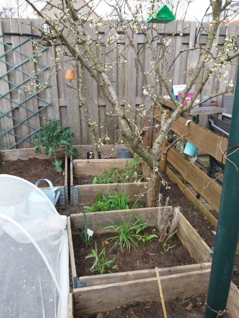 de peulen en de kapucijners achter groeien ook echt wel. De pruimenboom staat in bloei...gelijk de pruimenmotval er maar ingehangen!
