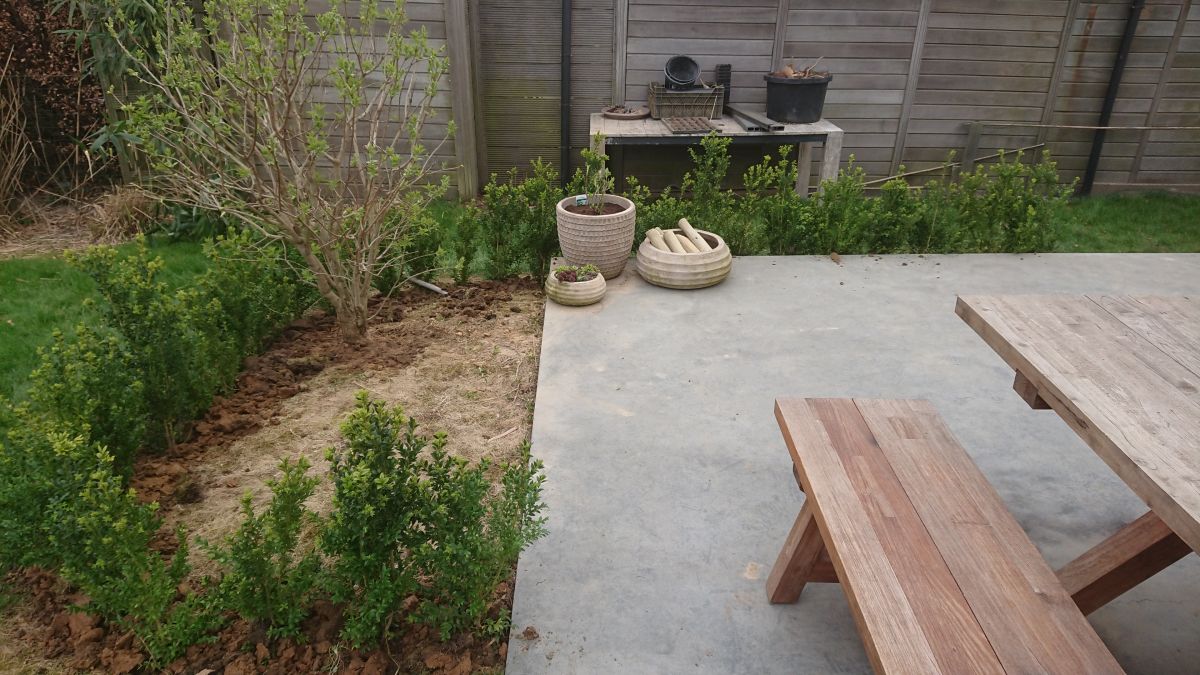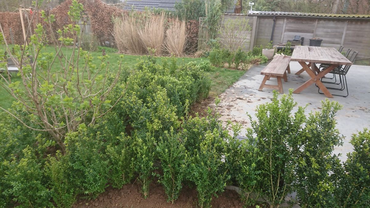 + 100 buxussen de grond in gestoken. Op elke hoek staat er 1 Sering in.