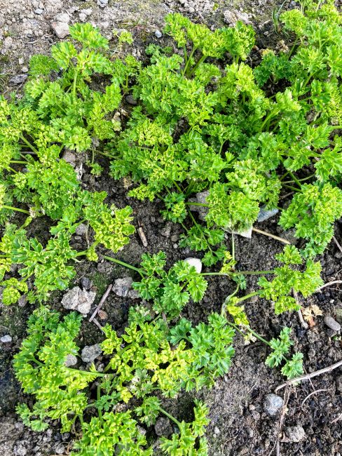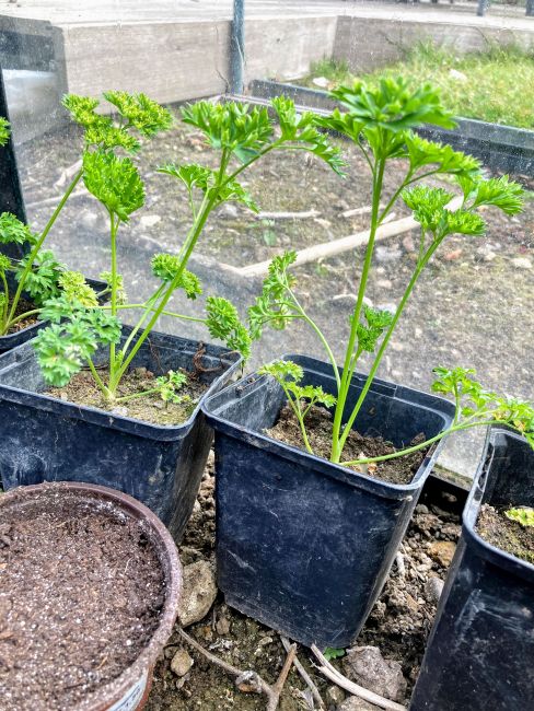 Peterselie. Een aantal plantjes had ik alvast in potjes in de kas gezet omdat ik nooit dacht dat het jonge plantgoed een paar nachten vorst zou overleven. Voorlopig zien de plantjes buiten (linker foto) er echter steviger en gezonder uit dan deze in pot (rechts) - die hoog opgeschoten lijken en wellicht dus zwakker? Ik wacht nog even voor ik ze verhuis naar hun nieuwe bestemming.