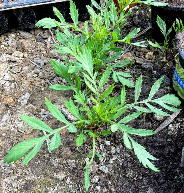 Ook een paar helpers komen hier en daar boven; de tabaksplant om witte vlieg in de kas te helpen bestrijden, en de afrikaantjes tegen ongewenste beestjes - heb ik me laten vertellen.