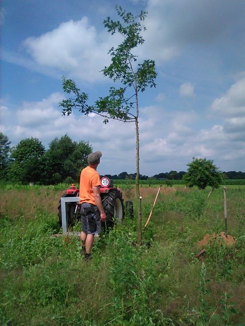 Deze was een beetje lelijk gesnoeid, we hebben er nog wat takken vanaf gehaald en laten het maar even zo. Er staan nu ook boompalen bij en we hebben er een greppeltje omheen gegraven die we vol kunnen laten lopen met water. Ook komt er nog flink stevige bescherming omheen zodat de ossen en de varkens er niet bij kunnen. Ze staan namelijk midden in een paar velden.