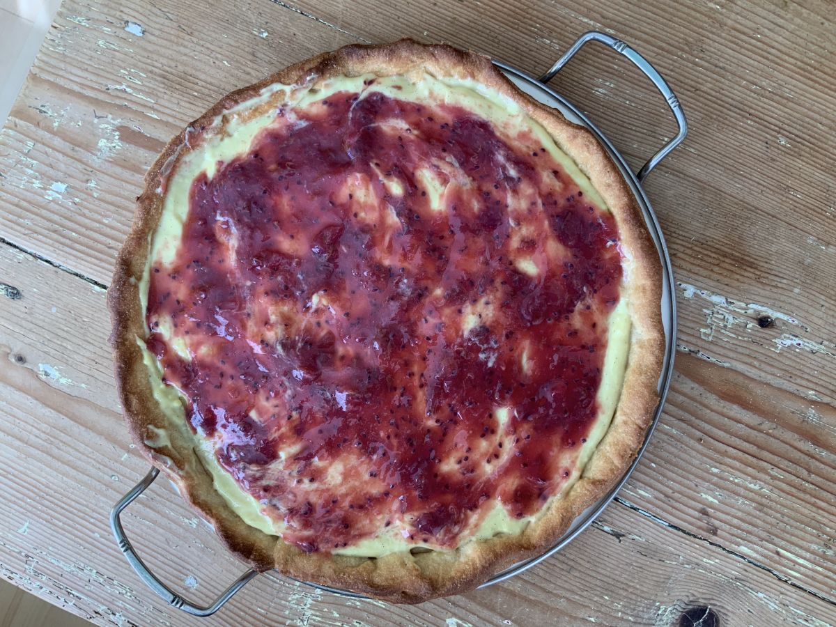 Maar ik had ook nog wel wat tijd om te bakken. Alleen werkte het recept voor de bodem en voor de vulling niet mee. De gist zorgde voor onvoldoende rijs en de kruisbessencompote was behoorlijk vloeibaar. Uiteindelijk is het een lekker taartje met banketbakkersroom en een laag saus erop geworden, maar die bodem… dat kan beter.