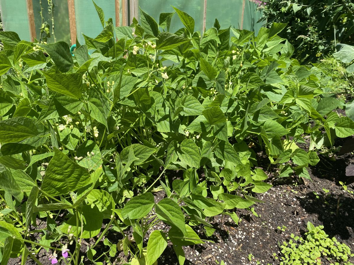 In de tuin zitten we in een soort oogstvacuum. De courgettes doen het wel, maar we komen er niet in om. De boontjes bloeien maar kunnen nog niet worden geoogst.