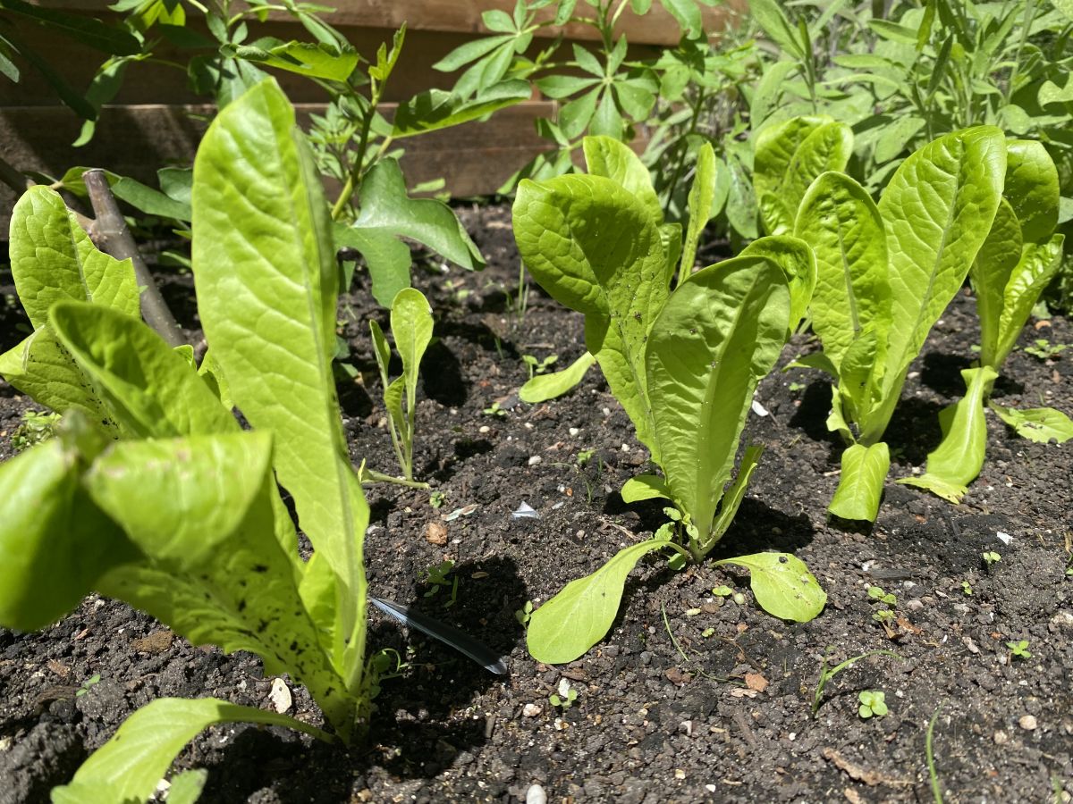 De bindsla groeit wel goed, maar is nog een beetje te klein om te oogsten. Dus oogsten we doorgeschoten sla van begin van de zomer en wat pluksla. Er is evengoed genoeg om van te eten.